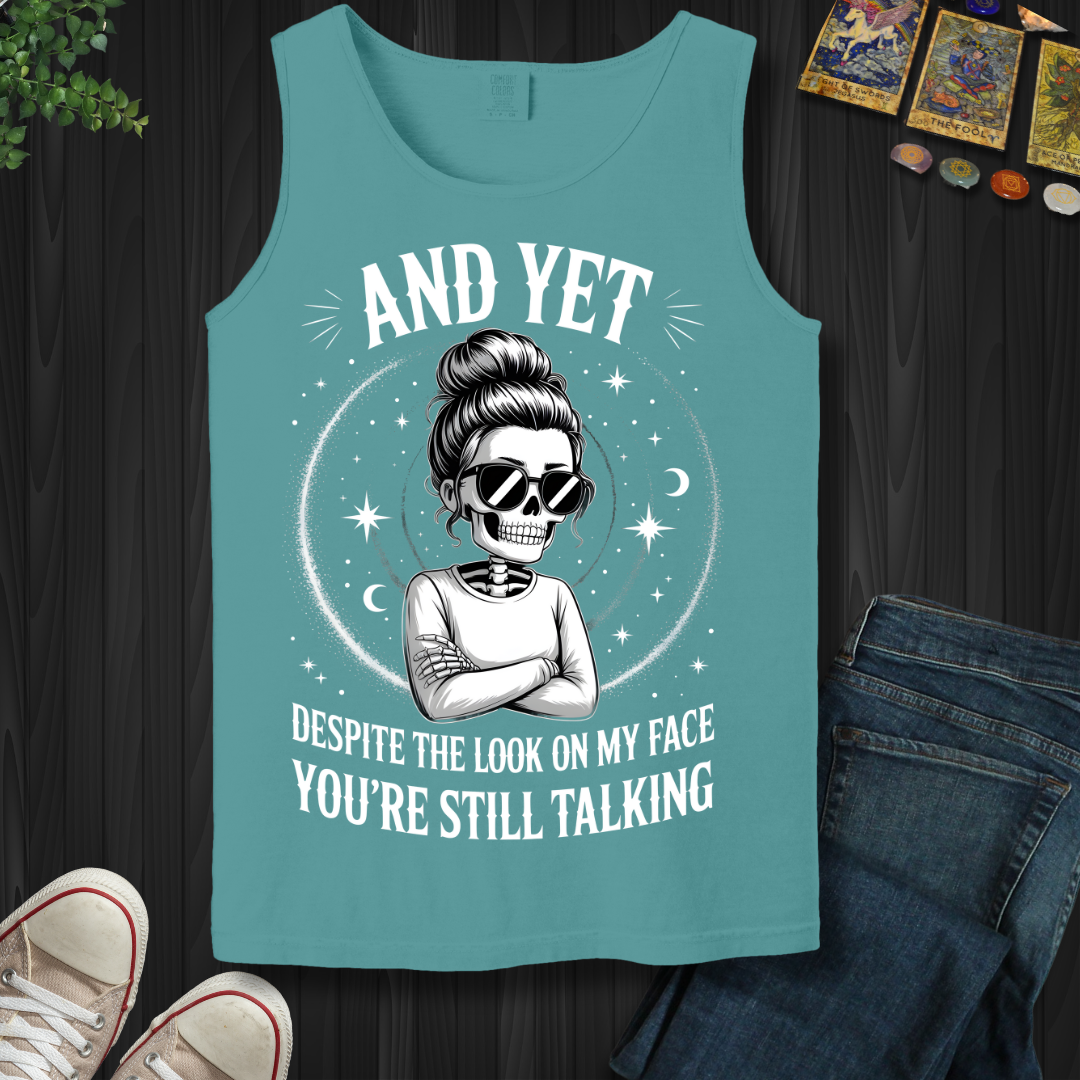 The vibe is dead inside, but the attitude’s eternal. This skeleton’s seen enough — arms crossed, stars swirling, and absolutely no time for your nonsense. For the mystic who’s tired, unbothered, and spiritually hexing you mid-eye-roll.