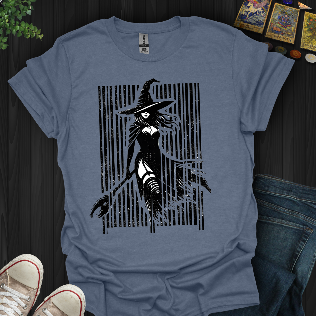 Unleash your inner enchantress with this bold and edgy witch design! Featuring a captivating figure in a striking black dress and witch hat, framed by a barcode-inspired backdrop, this tee combines modern vibes with mystical allure. ๐งน๐ค๐