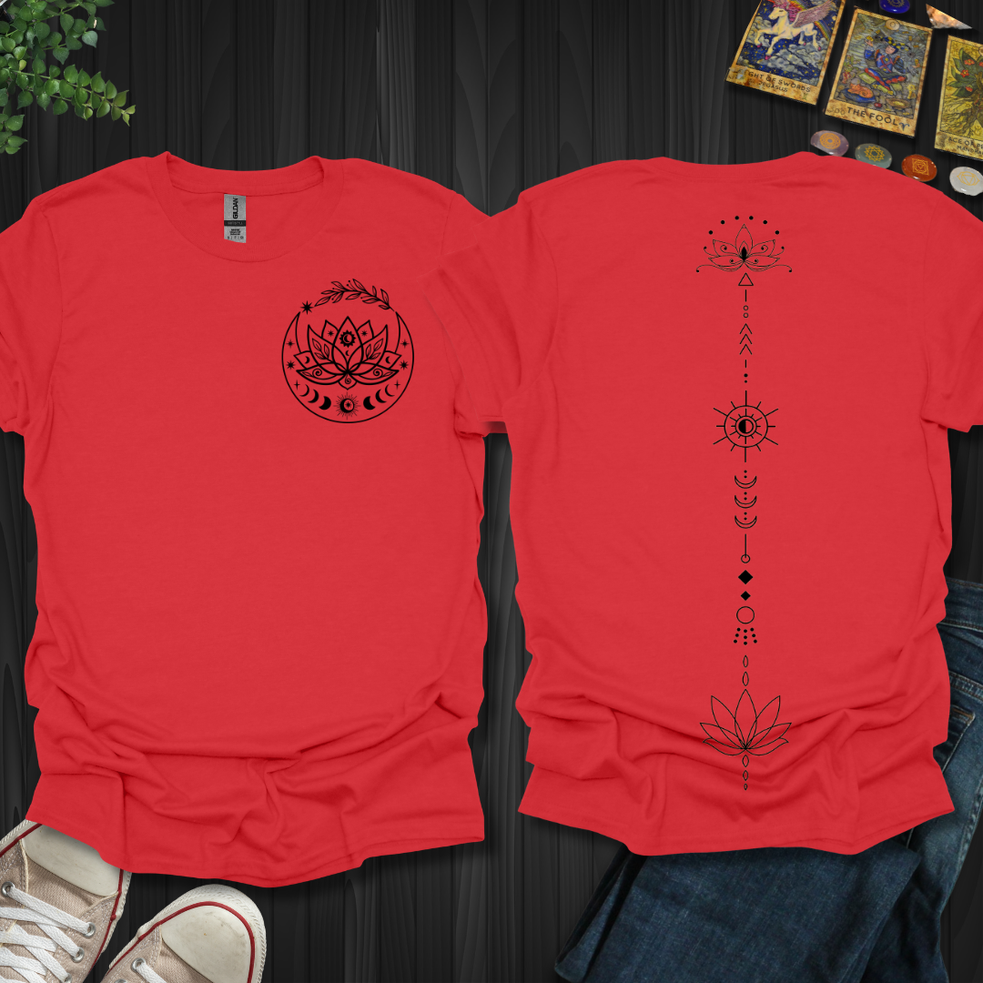 This front-and-back design blends celestial symbols, sacred geometry, and the grounded elegance of the lotus. A quiet statement for those who align with peace, presence, and a little bit of magic.