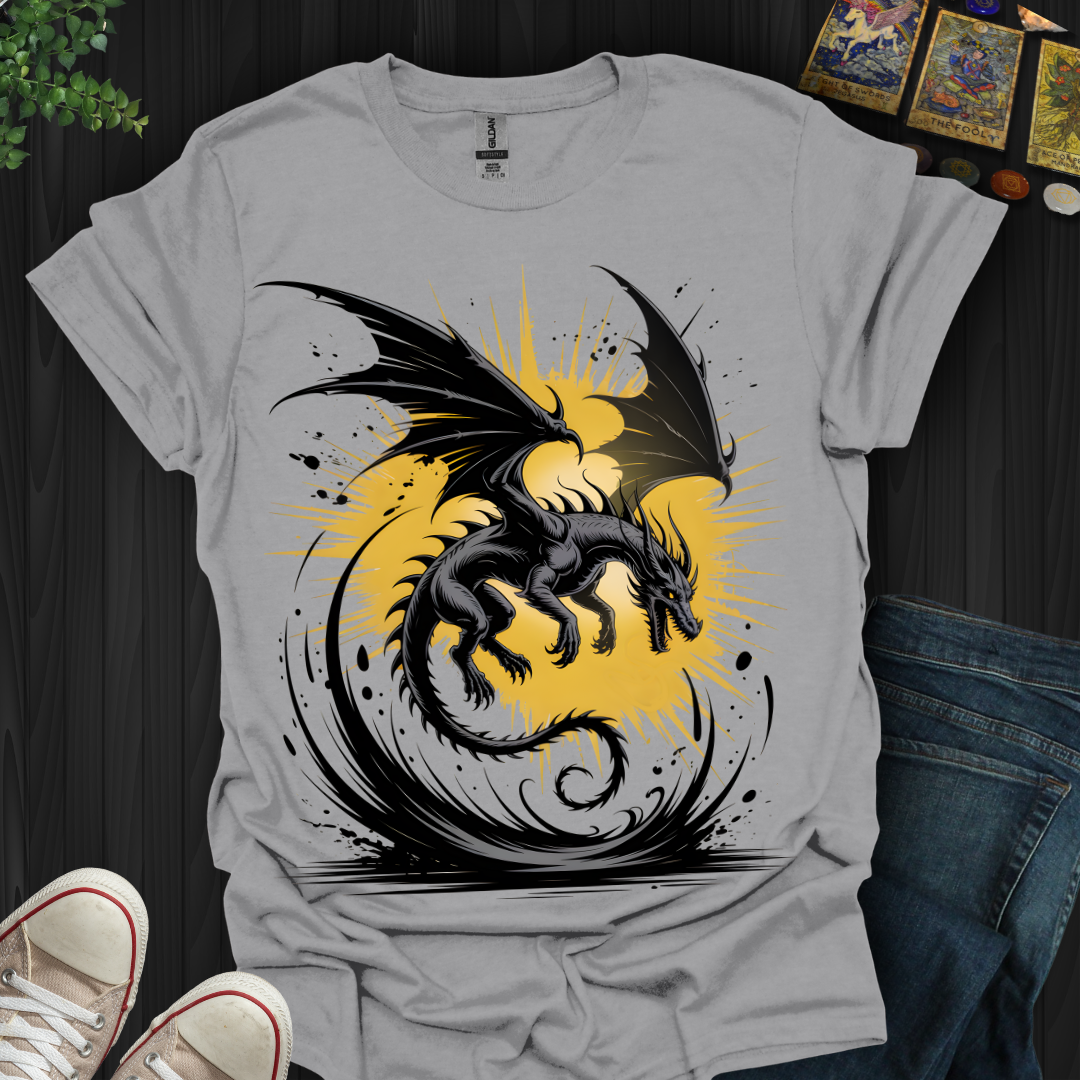 This fierce black dragon rises through golden flames and inky shadows—because subtlety was never the point. It's power, rebellion, and a little destruction, all wrapped in wings and smoke.
