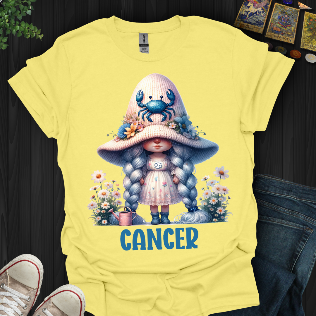 ✨🦀 A charming design featuring a mystical gnome embodying the nurturing and intuitive essence of Cancer. With flowing silver braids, a dainty floral dress, and a whimsical hat adorned with a proud blue crab, this artwork captures the zodiac’s caring and creative spirit. Perfect for astrology lovers and fans of magical, celestial designs! 🌙🌼