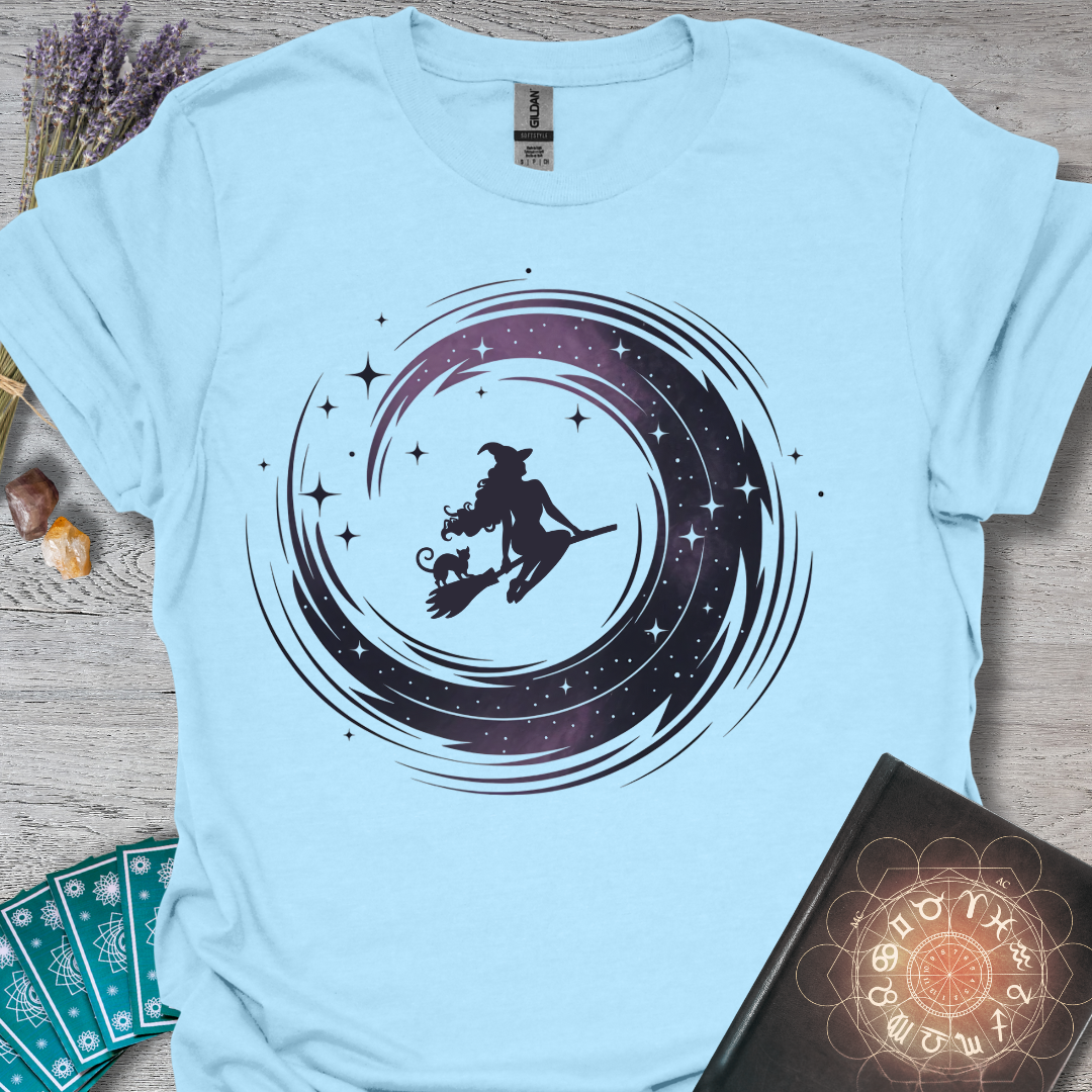 Ā š This mesmerizing design captures a mystical witch and her loyal cat companion gliding through a swirling cosmic wave of stardust. The silhouette effect, surrounded by stars and cosmic energy, brings a touch of the universe's wonder into a witch's journey. Perfect for those who love a blend of magic and celestial beauty, this design is ideal for any enchanted wardrobe! āØ