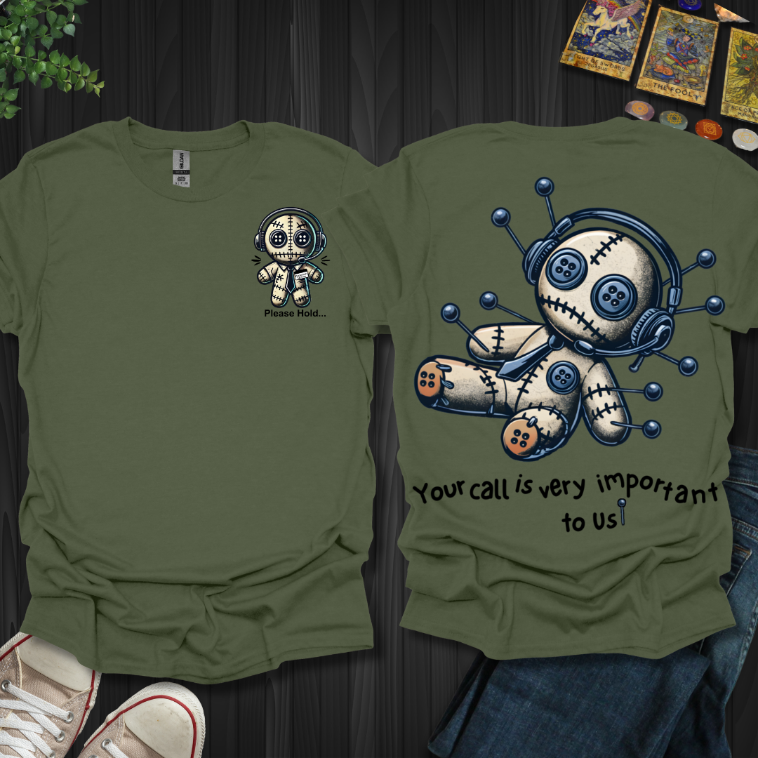 Ever feel like working customer service drains your soul? This double-sided tee embodies the struggle—front and back. The front features a stitched-up voodoo doll in a headset, trapped in the eternal loop of "Your call is very important to us..." while the back shows what really happens when patience runs out—pins and all. A darkly humorous tribute to every overworked, underappreciated customer service warrior.