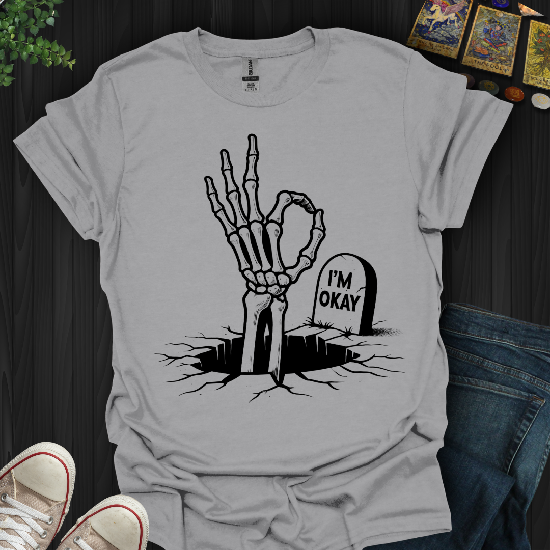 This hilariously grim design says what we’re all feeling: not great, not thriving… but technically still here. Featuring a zombie-style skeleton hand giving the most relatable OK sign ever, it’s the perfect tee for anyone whose emotional support system is dark humor and caffeine. ☠️✨