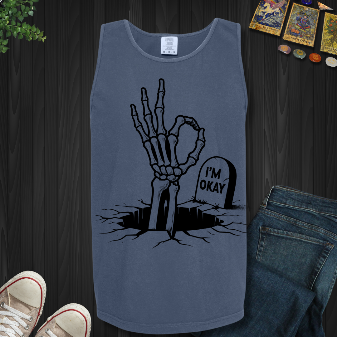 This hilariously grim design says what we’re all feeling: not great, not thriving… but technically still here. Featuring a zombie-style skeleton hand giving the most relatable OK sign ever, it’s the perfect tee for anyone whose emotional support system is dark humor and caffeine. ☠️✨
