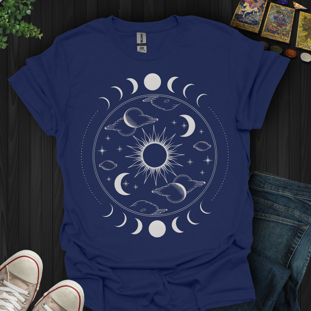 Dance with the cosmos in this mesmerizing design! 🌞🌙✨ Featuring a radiant sun, dreamy moons, and swirling clouds framed by lunar phases, it captures the balance of day and night, light and shadow. Perfect for stargazers, dreamers, and moonlit wanderers. 🌌 Embrace the celestial flow—add this to your mystical wardrobe today! 🌠