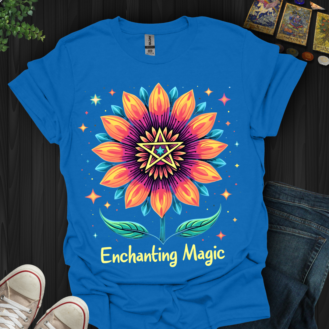 This vibrant design is truly eye-catching! The glowing sunflower, combined with the magical geometric symbols in the center, gives off a radiant and mystical energy. The "Enchanting Magic" text adds to the magical theme, making it a perfect t-shirt for anyone who loves bright, magical designs and spiritual elements. 🌻✨