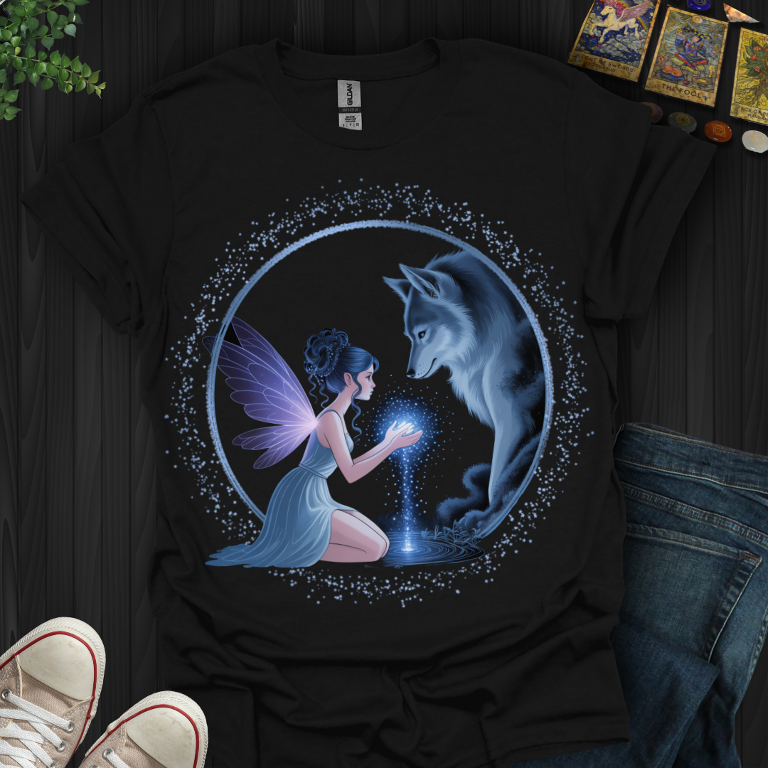Where fae magic meets untamed spirit. This enchanting design captures the sacred bond between a moonlit fairy and her loyal wolf guardian. For those who listen to the forest, trust their intuition, and walk the edge of the mystical and wild.