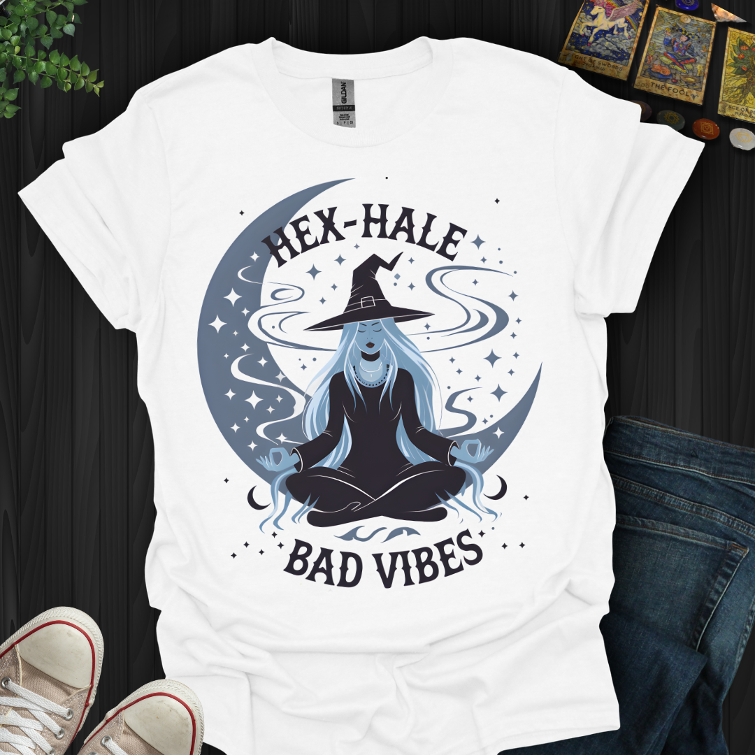 Find your inner peace and banish negativity with this mesmerizing design! Featuring a serene witch in a meditative pose, exhaling swirling clouds of “bad vibes” that dissolve into the cosmos, this tee is perfect for anyone who believes in breathing out the negativity and embracing calm, magical energy. Surrounded by stars and crescent moon, she reminds us that even witches need a moment to hex-hale. 🧘♀️🌌