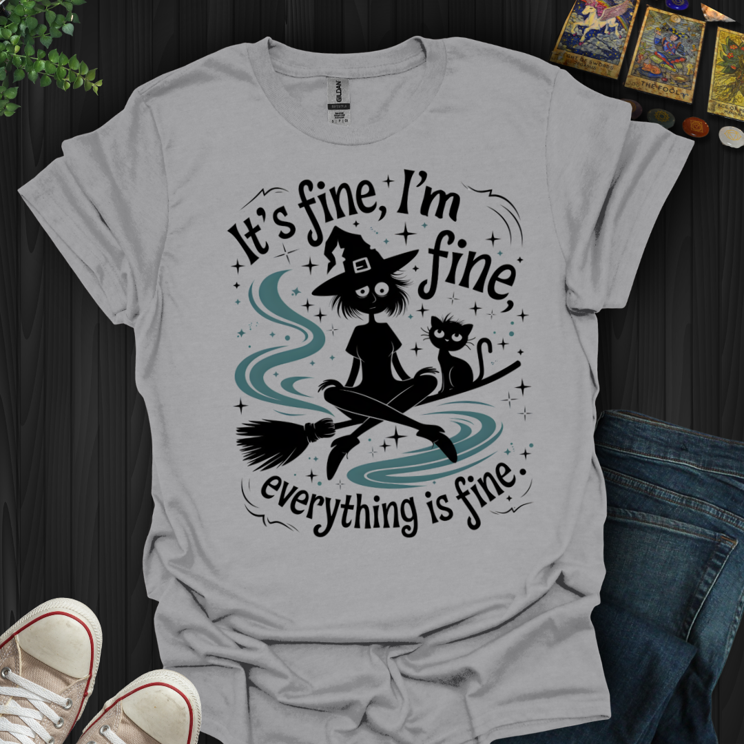 This whimsical design screams witchy chaos vibes! 🧙♀️✨ 'It's fine, I'm fine, everything is fine'—because even witches have their off days! 🐈⬛🪄