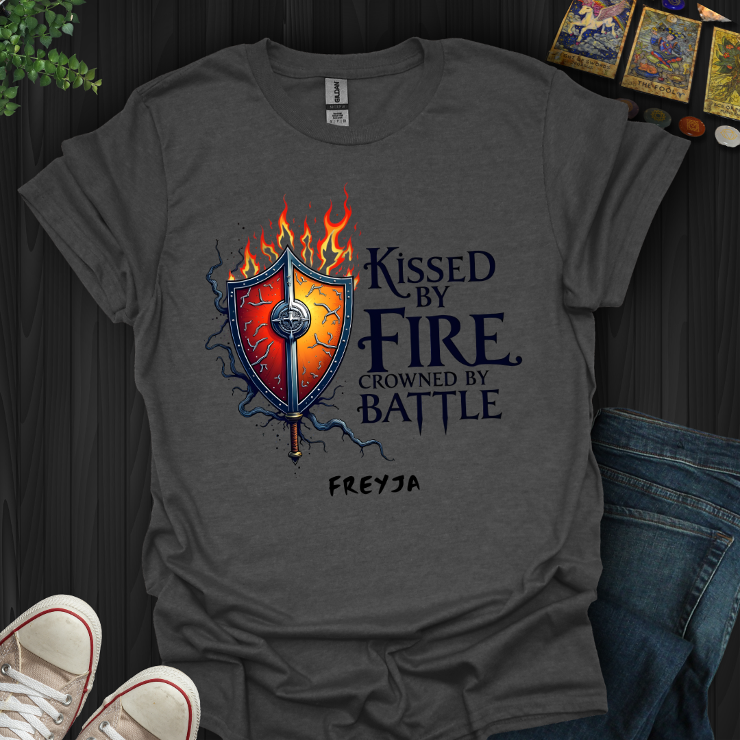 Blaze your own myth with this fierce, fire-forged tee. Featuring a scorched shield still standing proud, this design is for those who walk through chaos and come out crowned in smoke and sparks. Whether you're slaying dragons or just Monday, let the world know: you were kissed by fireāand came out royalty.