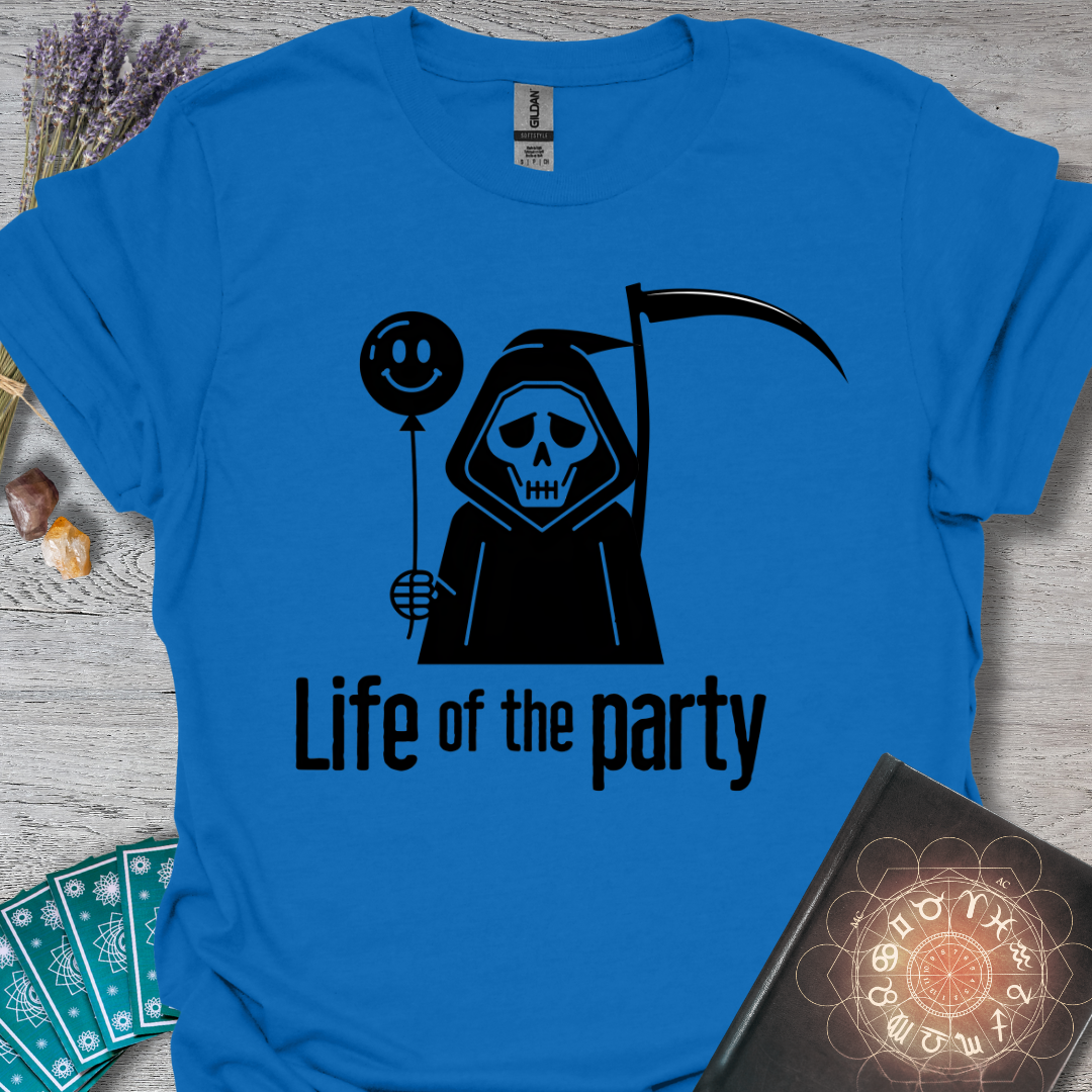 💀 This tongue-in-cheek design depicts a melancholic Grim Reaper holding a cheerful balloon, paired with the phrase "Life of the Party." Perfect for those who appreciate dark humor, it humorously contrasts the Reaper’s somber look with the upbeat balloon, highlighting the irony. This design is ideal for anyone who embraces life’s dark and humorous sides, bringing a bit of playful morbidity to any occasion. 🎈💀