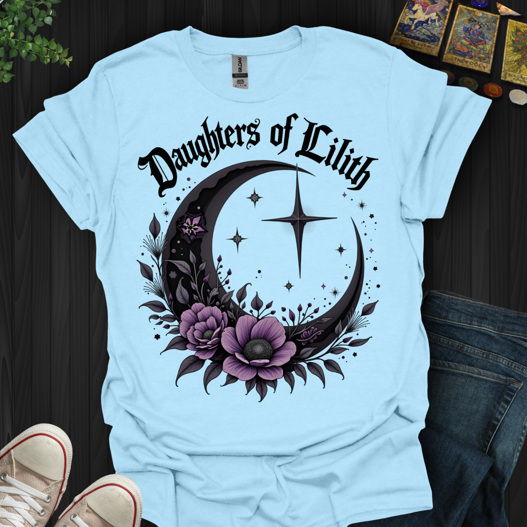 Unleash your dark feminine power with this enchanting design! A shadowy crescent moon cradles blooming purple flowers, surrounded by shimmering stars and celestial magic. 🌌✨ The gothic script proudly declares Daughters of Lilith, celebrating rebellion, mystery, and untamed beauty. Perfect for those who walk boldly in their power—claim your lunar legacy! 🖤💜