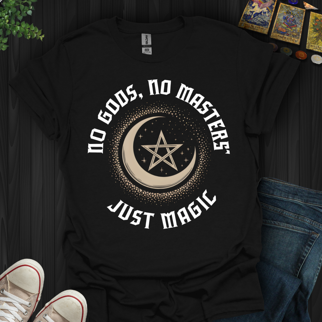 Break free from the chains of conformity with this bold celestial design! Featuring a golden crescent moon cradling a pentagram, surrounded by shimmering stardust, this shirt proudly declares: No Gods, No Masters—Just Magic. 🖤🌌 Perfect for witches, rebels, and dreamers who answer only to the call of the cosmos. Claim your mystical independence today! 🌟🪄