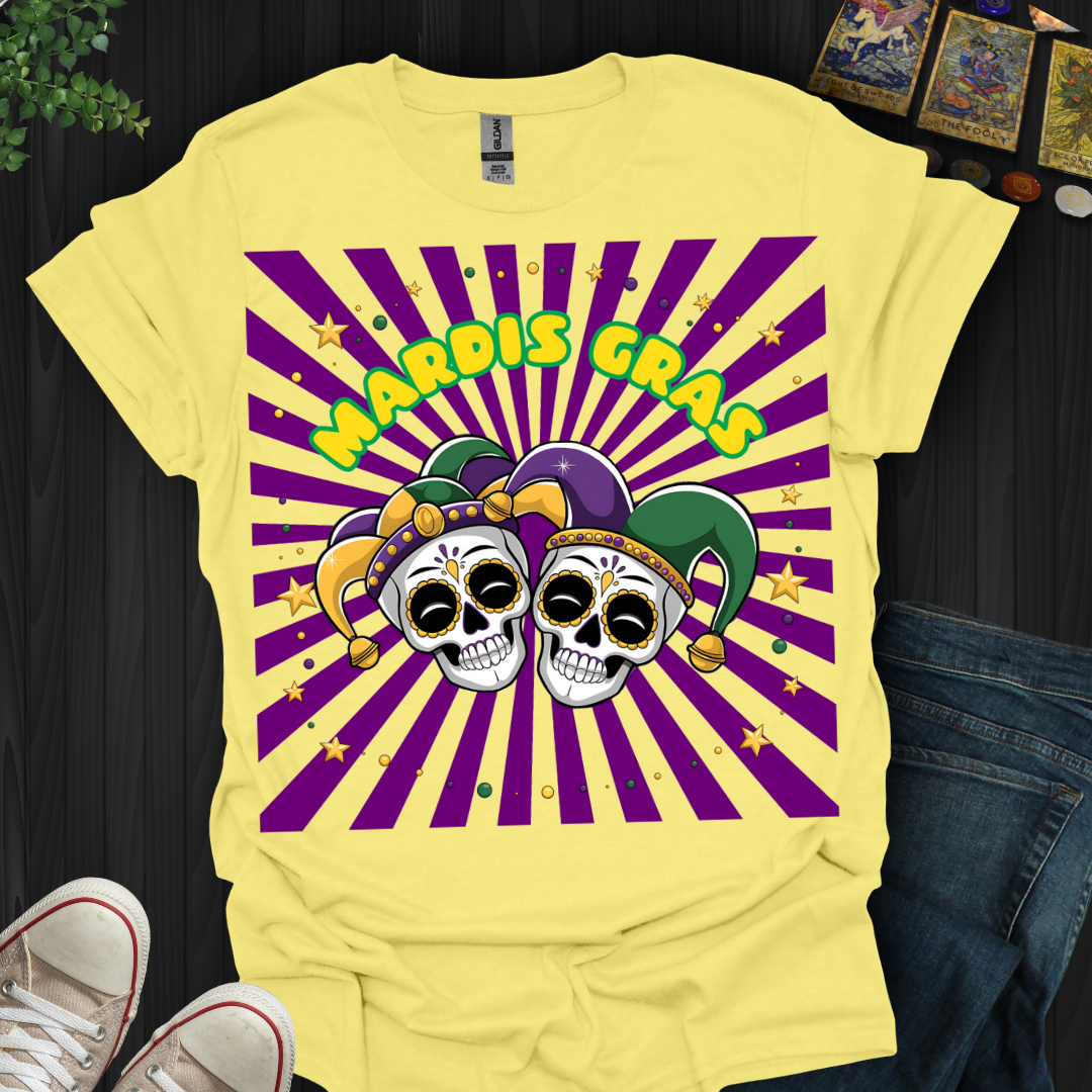 Let the carnival spirit live on with this vibrant, skull-tastic Mardi Gras design! 💜💛💚 Featuring festive sugar skulls in jester hats, this bold and lively look captures the magic of the season. Perfect for those who celebrate life with flair and a little mystery! 🎶✨🎭