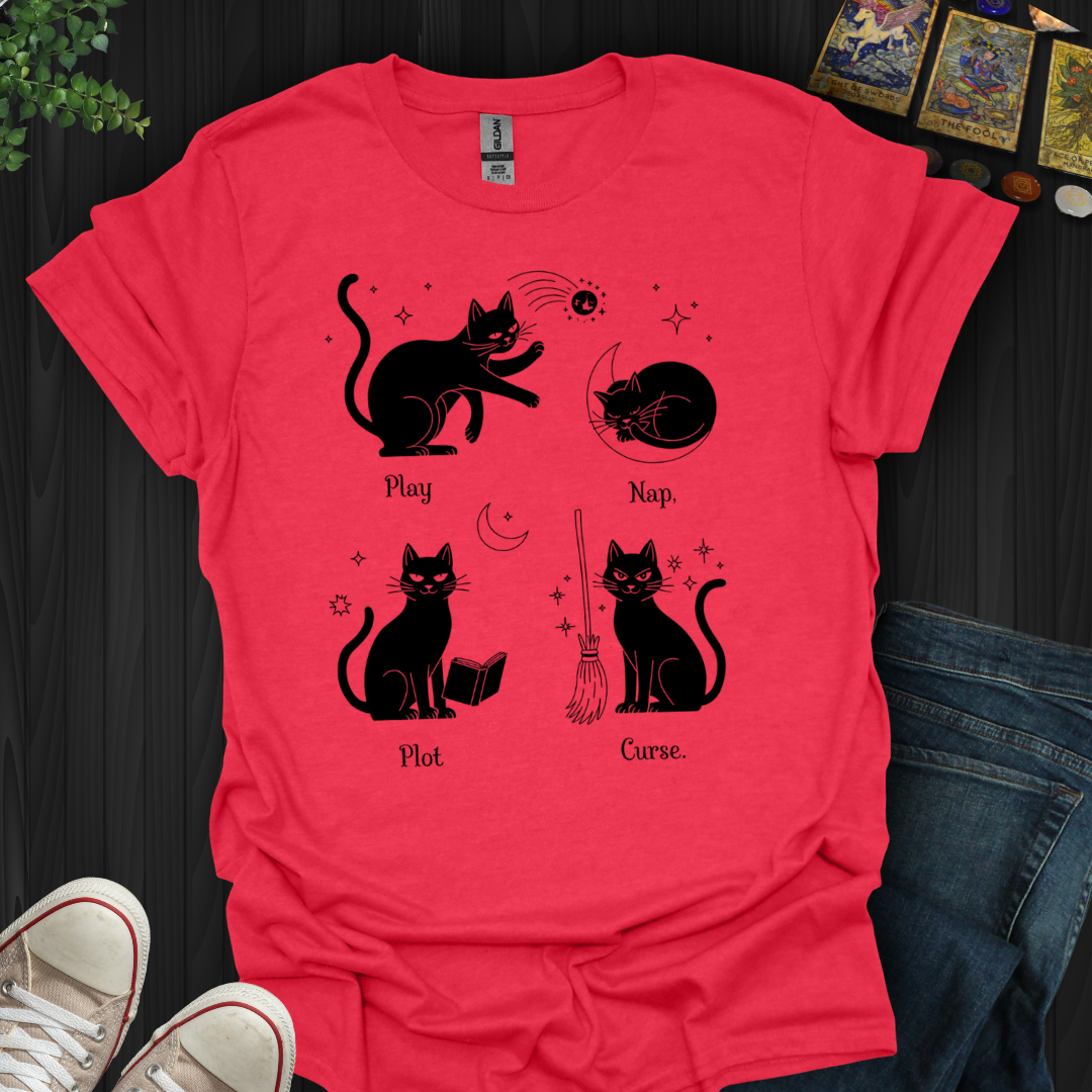 A cheeky and fun design that perfectly sums up a witch’s daily agenda: “Play with cats. Nap. Plot revenge. Curse someone.” 🐈⬛✨ Perfect for those who balance their magic with a dash of humor and a lot of cat cuddles! 😈🪄