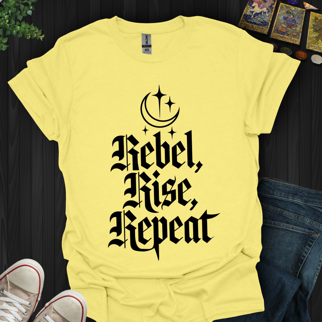 Embrace the rhythm of defiance with this gothic masterpiece! Featuring elegant blackletter script proclaiming Rebel, Rise, Repeat beneath a crescent moon and sparkling stars, this design radiates celestial resilience. 🌙✨ For the bold souls who rise from the ashes stronger each time—this one’s for you. Wear it, own it, rise again. 🔥🌌