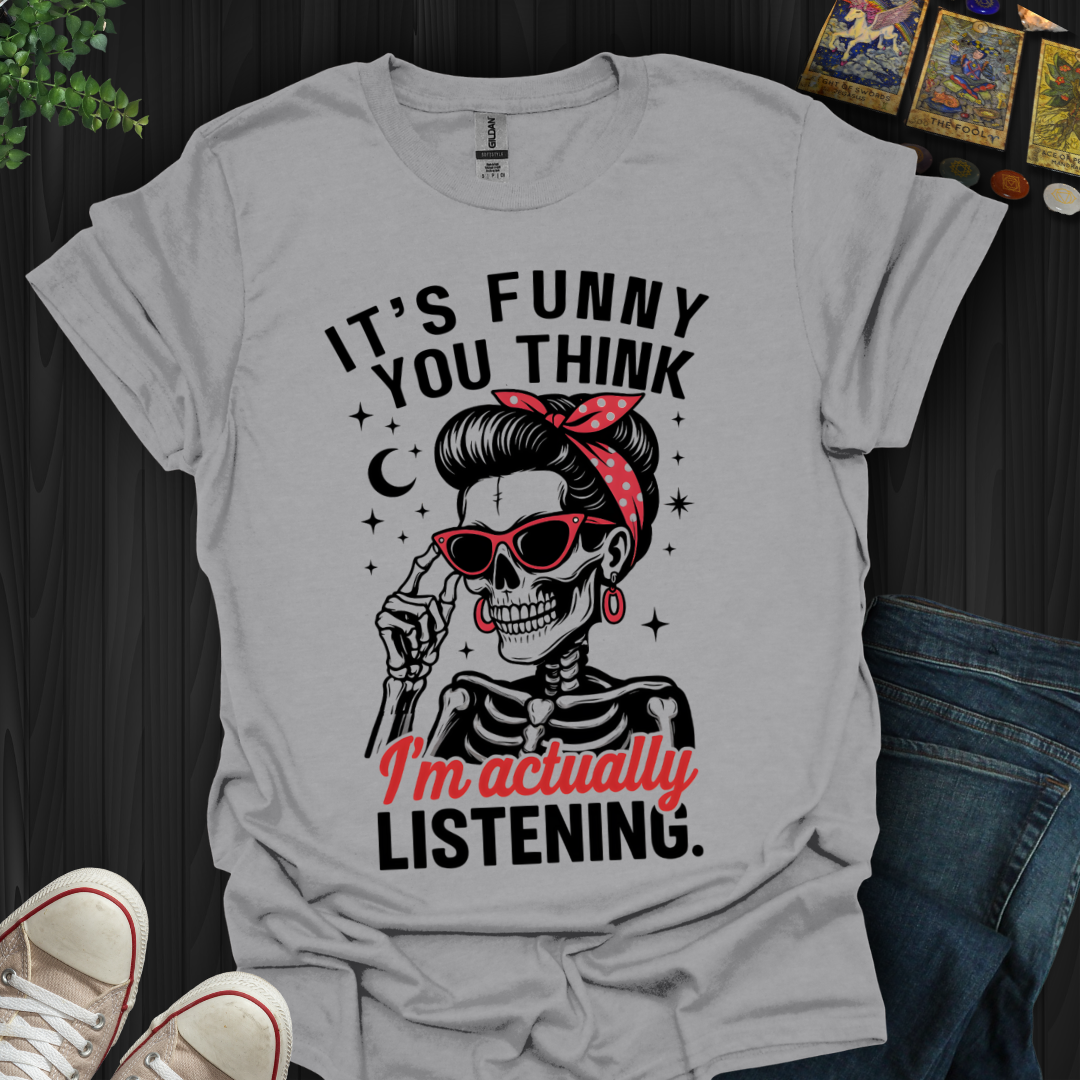 For those days when your patience is as thin as your bones! This fun and edgy design features a retro-styled skeleton woman in red accents, with a cheeky reminder: "I'm actually listening." Who says attitude and humor can’t be the same thing?