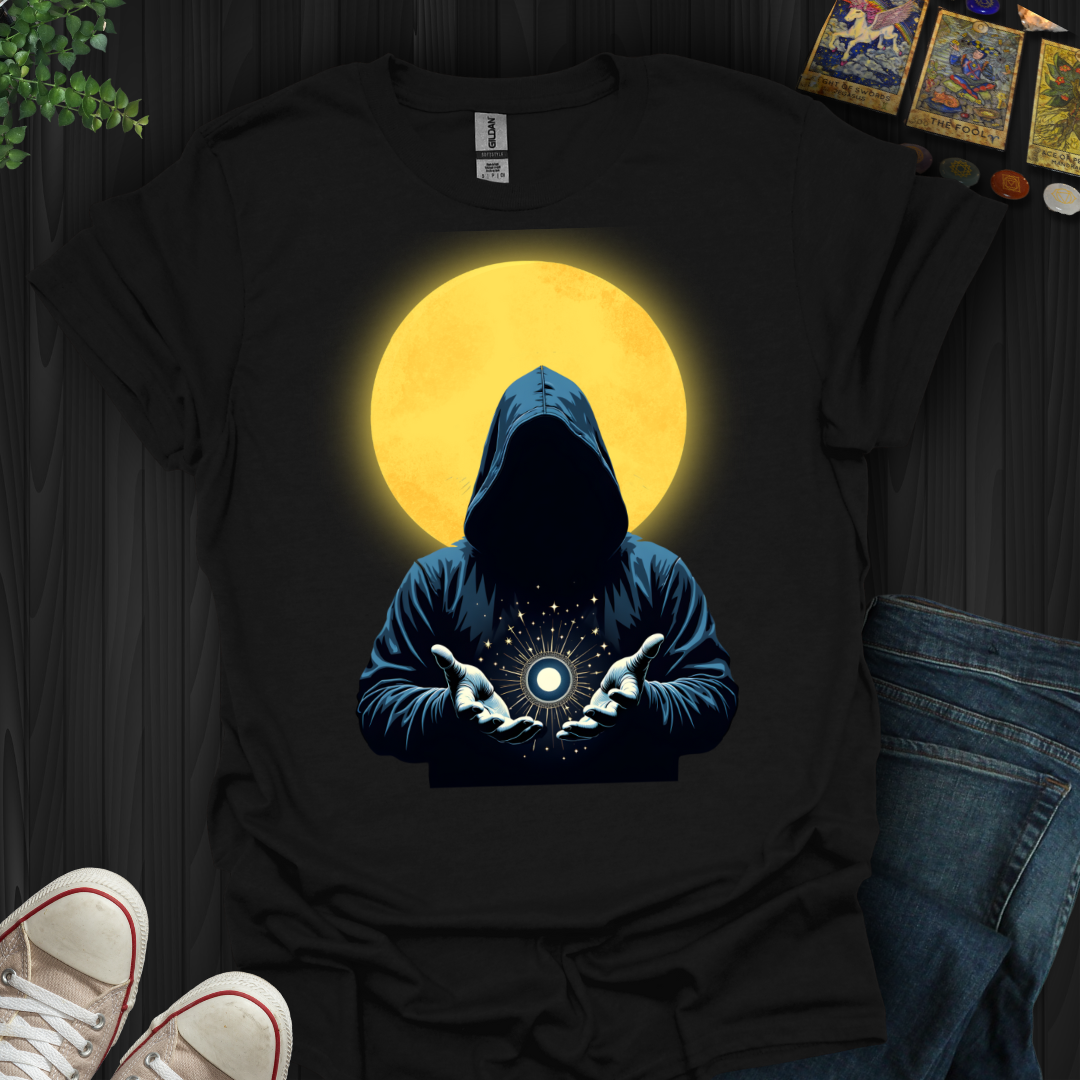 Cloaked in mystery, bathed in light—this design embodies the balance of shadow and illumination. A hooded figure summons cosmic energy, framed by a radiant sun, symbolizing power, enlightenment, and the unseen forces at play. Perfect for those who walk between worlds, harnessing both the darkness and the dawn.