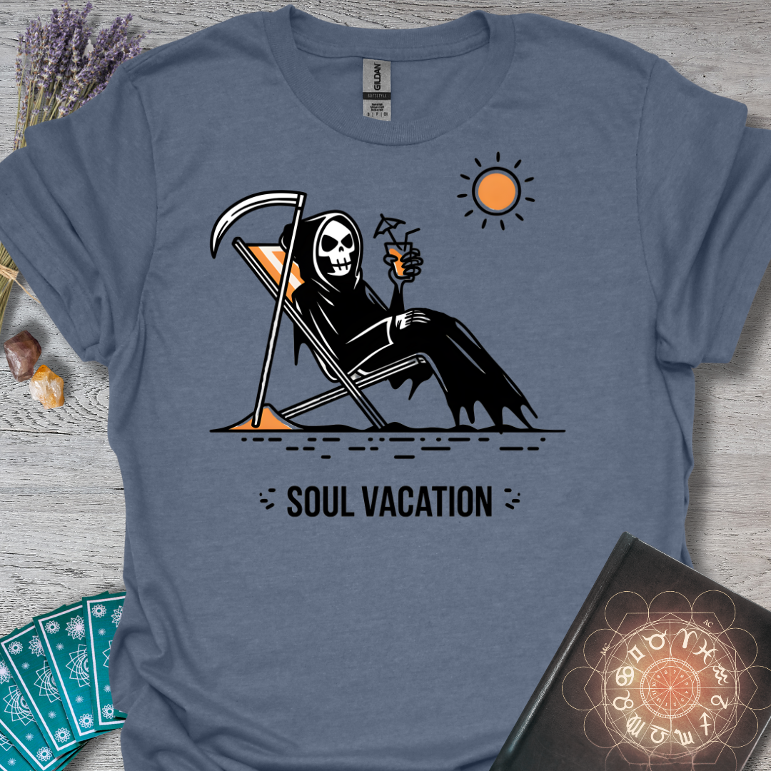 Even the Grim Reaper needs a break! This lighthearted design features the Reaper lounging on a beach chair with a cocktail in hand, enjoying a "soul vacation" under the sun. Perfect for those who find humor in life’s darker themes and love a twist on relaxation. 🌞🍹💀