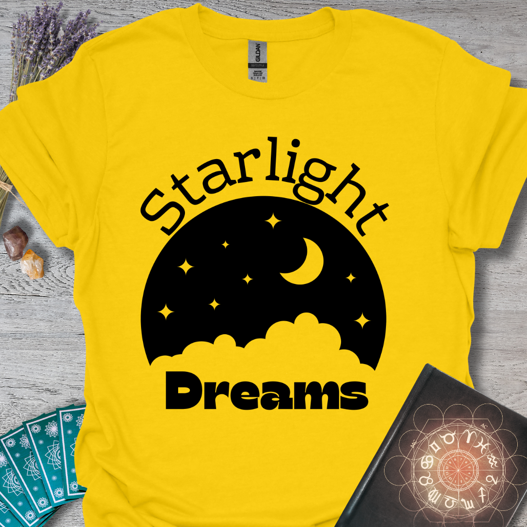 ✨ Embrace the magic of night with this dreamy design! Featuring a bold black crescent moon surrounded by stars, peeking over a cloud silhouette, this shirt captures the beauty of stargazing on a clear night. The playful “Starlight Dreams” text arches over and under the night scene, bringing a sense of wonder and comfort. Set against a bright daisy yellow background, this shirt is a perfect match for stargazers, dreamers, and those who find peace under the night sky.