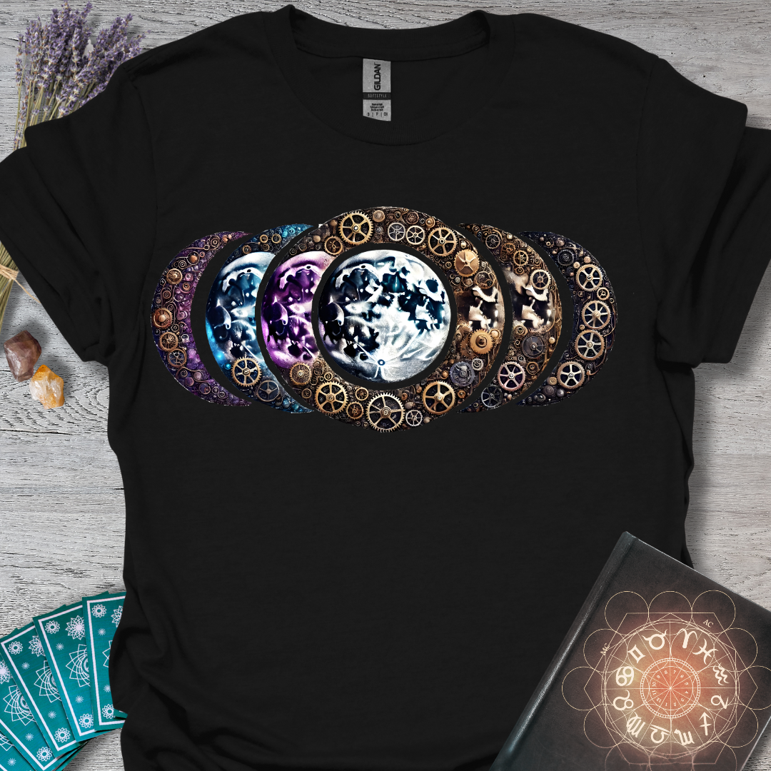 🌌⚙️ This stunning design merges the phases of the moon with intricate steampunk elements, surrounded by a framework of gears, cogs, and metal detailing. The deep, cosmic colors fade through each moon phase, creating a mesmerizing effect against the black background. Perfect for lovers of the night sky, steampunk aesthetics, and the celestial dance of lunar cycles, this shirt captures the essence of a timeless, mechanical cosmos in motion.