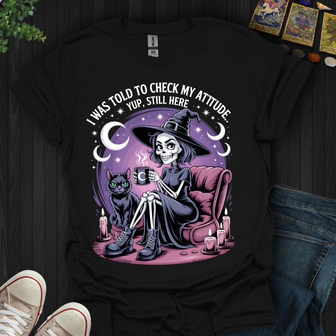 This delightfully defiant design features a chill skeleton witch and her judgmental cat, proving once and for all that yes, the attitude is still fully intact. Wrapped in purples, moons, and unapologetic vibes, this tee is made for those who don’t tone it down—even from beyond the grave.