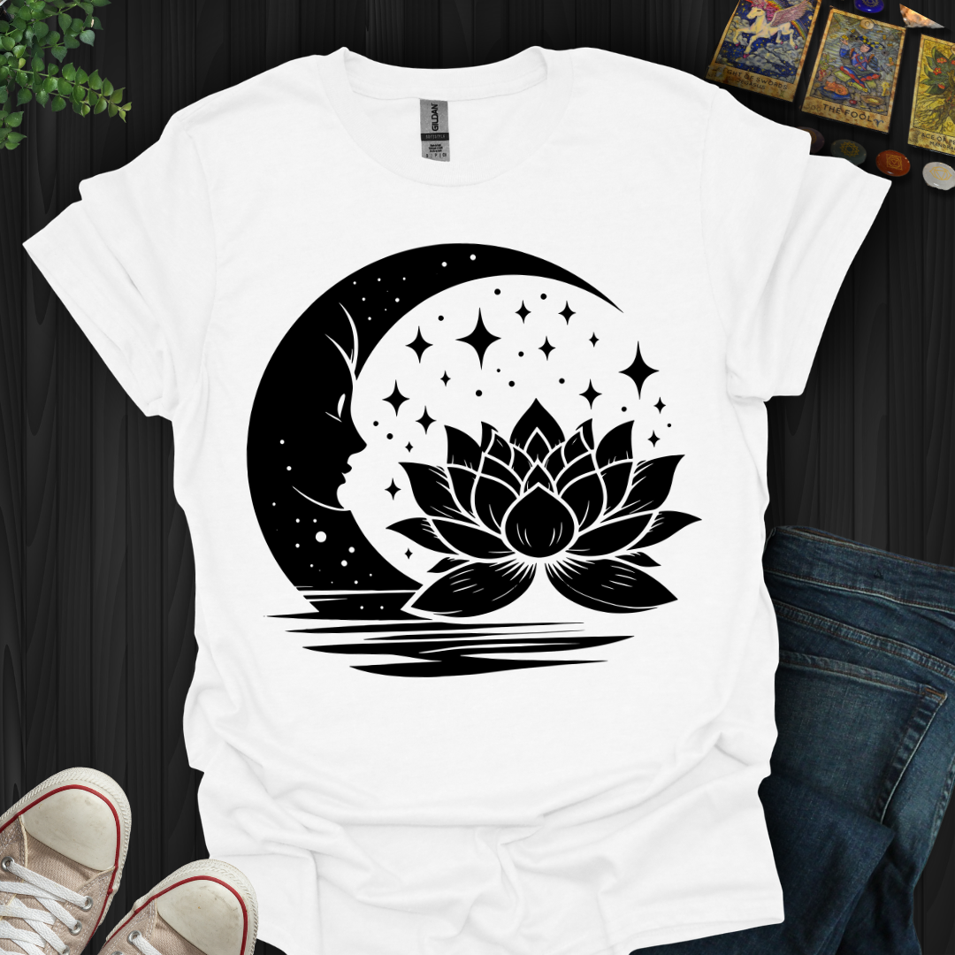 🌙✨ Dive into the serene beauty of the cosmos with this enchanting design. A tranquil lotus blossoms beneath a star-studded moon, reflecting a harmonious connection between earth and sky. Perfect for those who find peace and power in the universe's mysteries. 🌌🖤