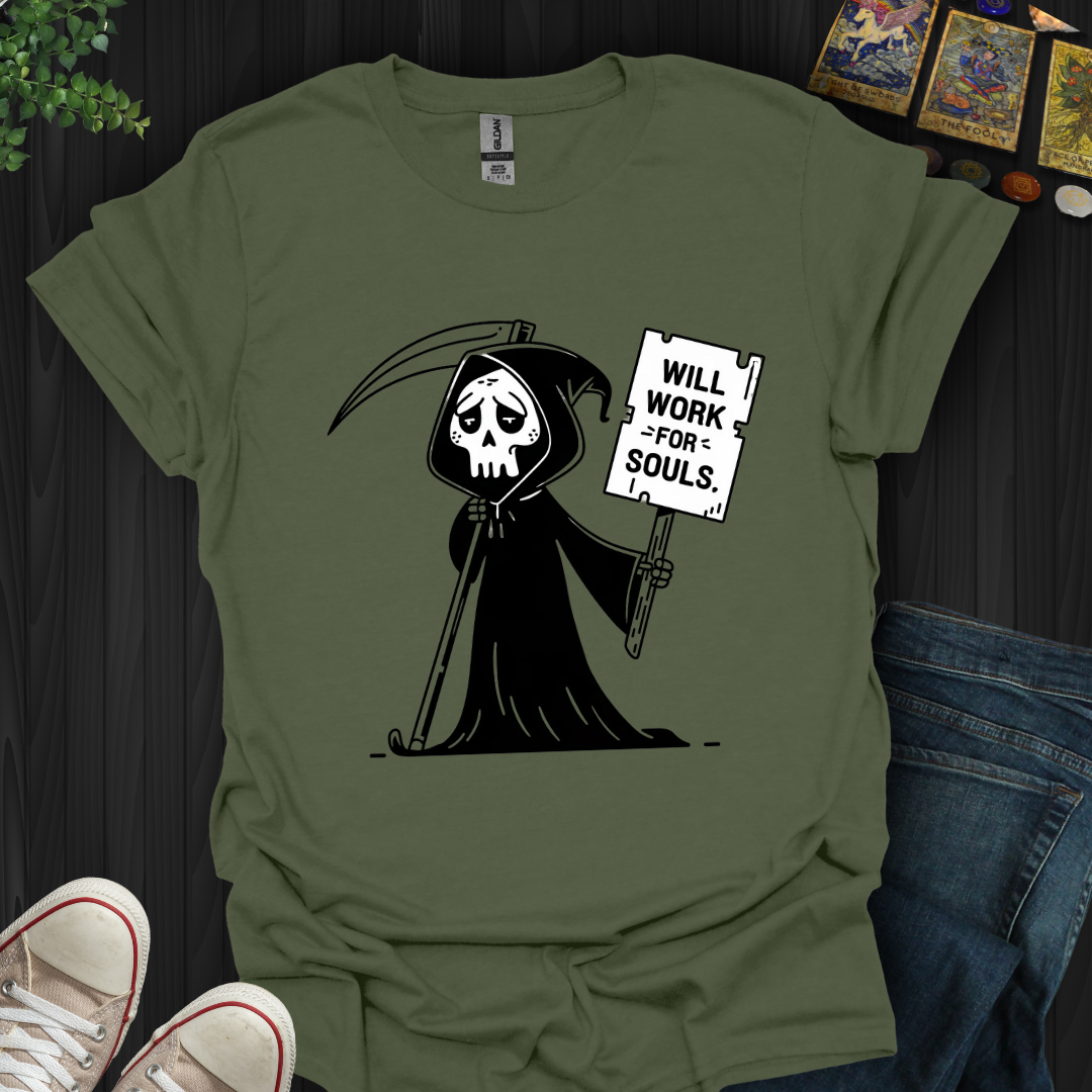 This humorous design features a downtrodden Grim Reaper holding a sign that reads "Will Work for Souls." Perfect for those who enjoy a dark yet funny twist on classic themes, showcasing the Reaper's "job-hunting" side. This design brings a blend of wit and irony, making it ideal for fans of gothic humor. 💀🪦