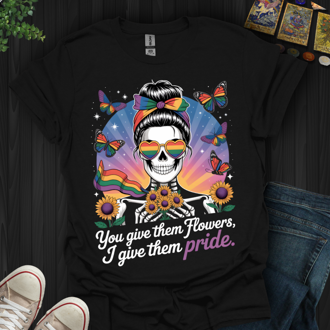 Forget the typical bouquets—this fierce, rainbow-clad skeleton brings pride to the party! Wrapped in sunflowers and rainbow butterflies, this design is all about standing out and showing your colors. Whether you're gifting it or wearing it, let the world know that your love is as bright and boundless as a summer rainbow. 🌻🦋🏳️🌈